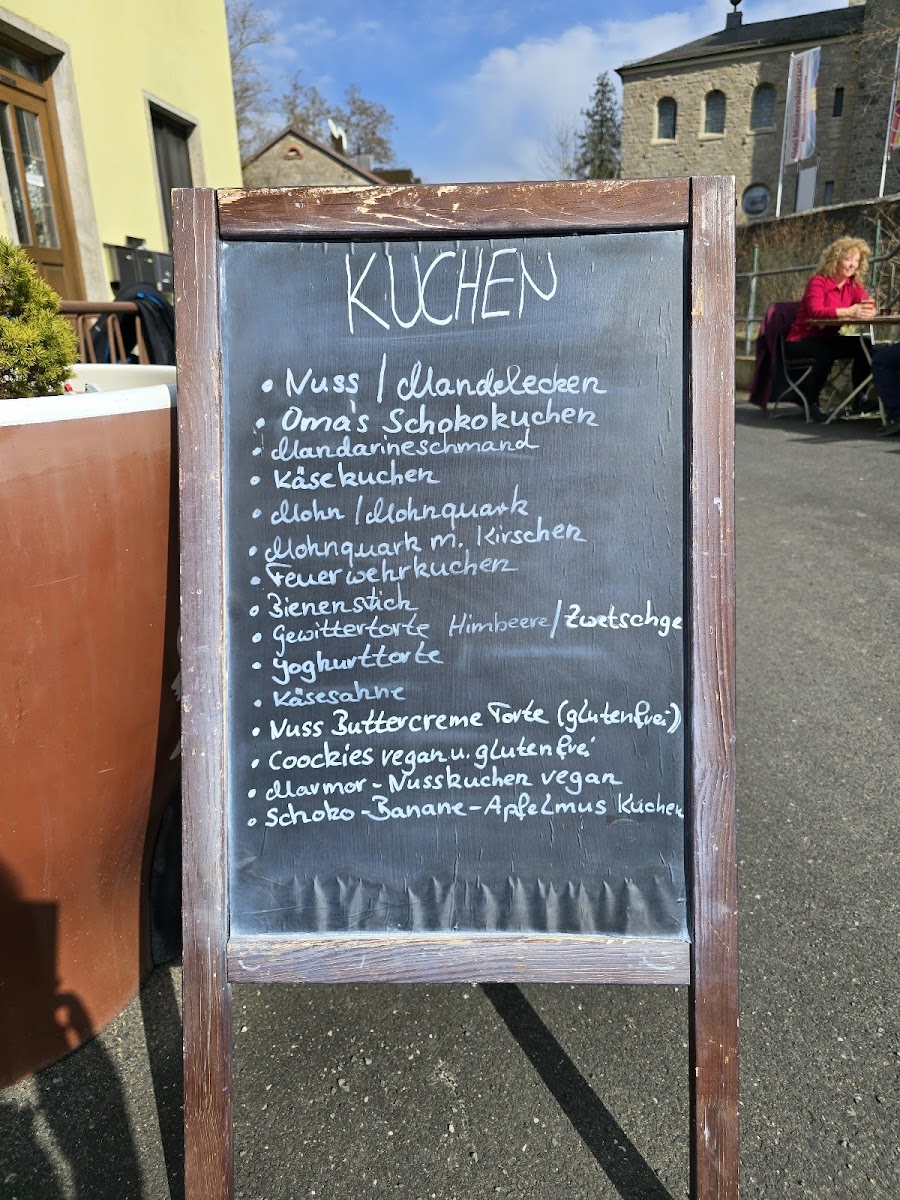For food offerings, the menu highlights a variety of homemade cakes and confections. These include traditional German pastries and tarts such as Nussecken, Käsesahnetorte, Pfirsichjoghurttorte, Schokokuchen, Zwetschgenplotz, Joghurt Mohnkuchen mit Streusel, Mandelecken, Kirschkuchen mit Streusel, Mandelstreuselecke, Prügel Torte, Mandarinenschmandkuchen, and Quarkstollen. Additionally, light savory options like pretzels are available.
